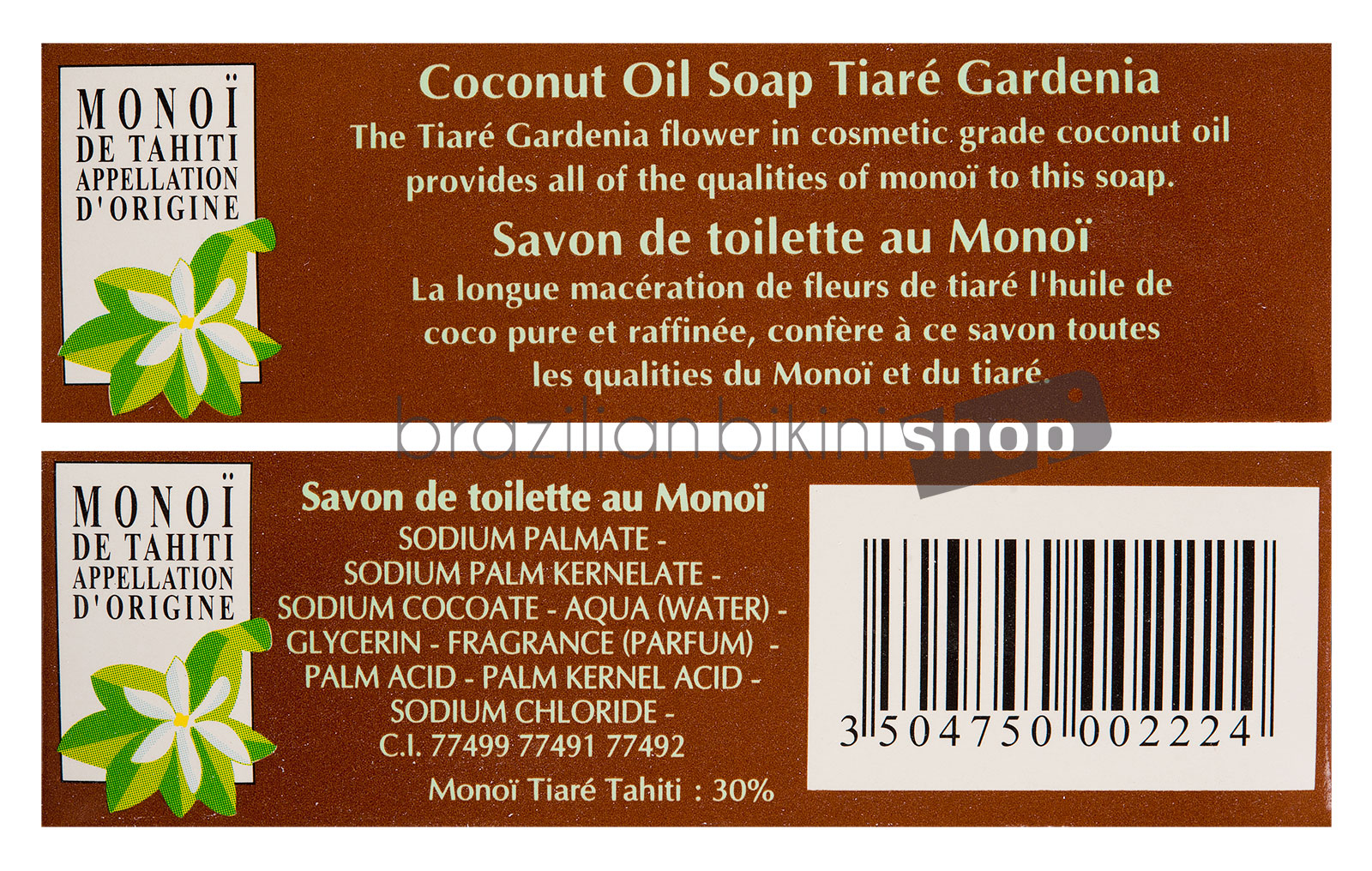 - Matière: 2% Monoï de Tahiti Appellation of Origin ECOCERT COSMOS. Sodium palmate, sodium palm kernelate, palm acid, palm kernel acid, aqua, glycerin, sodium chloride, Parfum, Cocos nucifera oil, gardenia tahitensis flower, tocopherol.